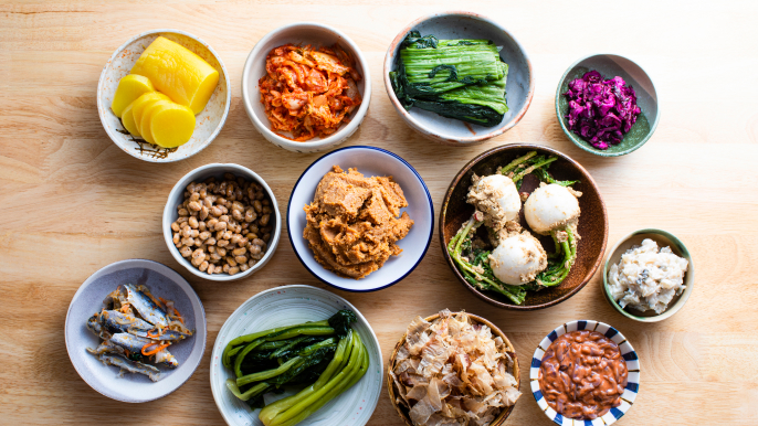 生きた善玉菌であるプロバイオティクスは、おもに発酵食品に多く含まれています。プロバイオティクスを含む食品の代表例は、ヨーグルトです。市販のヨーグルトのパッケージには、商品に含まれる乳酸菌の種類が記載されているので、購入の際に確認すると良いでしょう。そのほかに、納豆、キムチ、ぬか漬け、味噌、ナチュラルチーズなどもプロバイオティクスを豊富に含む発酵食品です。