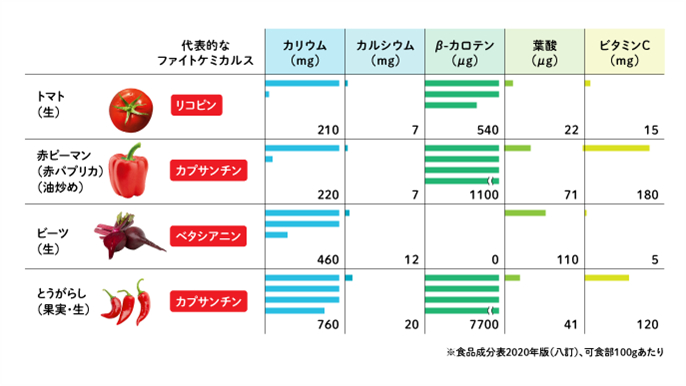カロテノイドを含む赤色の野菜を紹介します。代表格のトマト以外に、赤ピーマン(赤パプリカ)、唐辛子、ビーツなど。代表的な栄養成分を見ていくと、カロテノイドだけではなく必要な栄養素であるカリウム、ビタミン類、葉酸などが豊富なことがわかります!