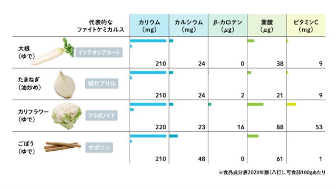 大根、白菜、カリフラワーは、見た目は違えど同じアブラナ科の野菜で、殺菌効果や活性酸素吸収力が高い。白菜、キャベツでは感じにくいが、大根のほのかな香りに代表される「イソチオシアネート」というファイトケミカルを含んでいる。